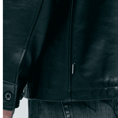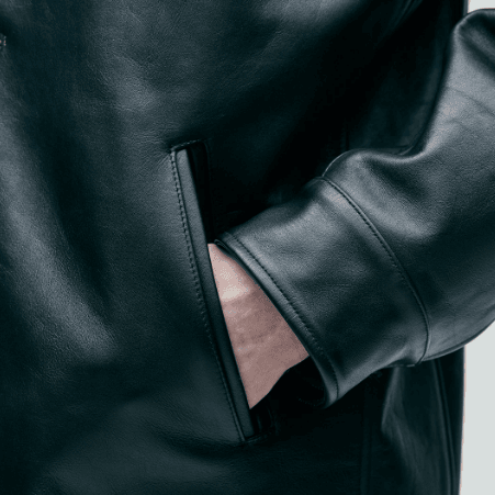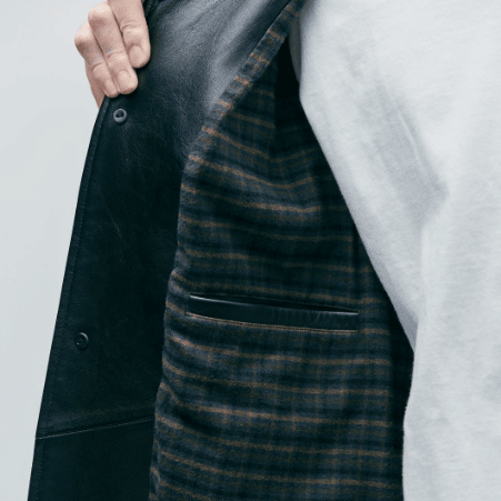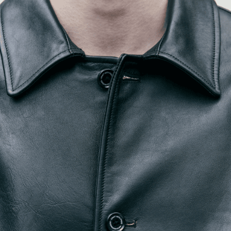 重厚ながら着込むほどに体に馴染む茶芯のカウレザーを使用したレザーカーコート。裏地にはチェック柄のビエラ生地を採用。オリジナルの4つ穴ボタン、サイドシームにピスネームを付属。