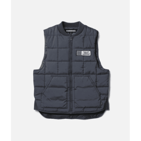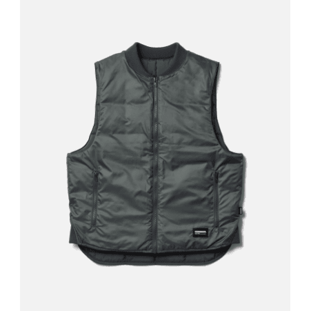 撥水性を備える異なるポリエステルタフタ素材を両面に使用したリバーシブル仕様のパッディドベスト。表面にはリサイクルポリエステル原料を使用し、フリーフッ素撥水加工を施したポリエステルタフタのキルティング素材を採用。裏面には、静電性と撥水性を兼ね備えたポリエステルタフタ素材を採用。各面にロゴプリントとロゴワッペンを配置。ピスネームを付属。