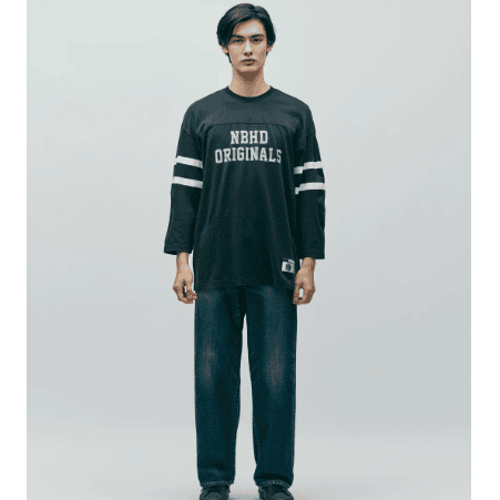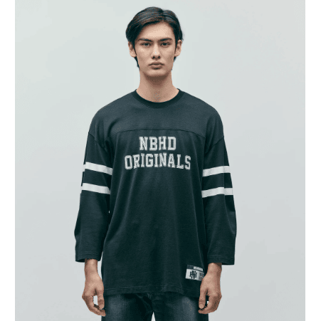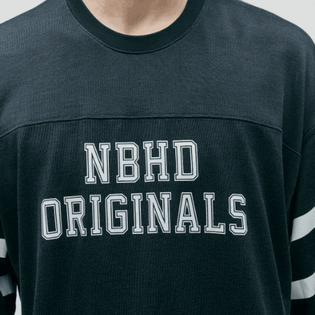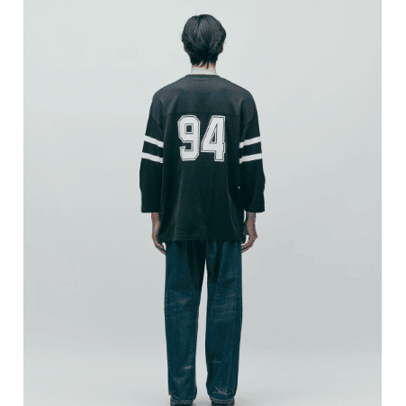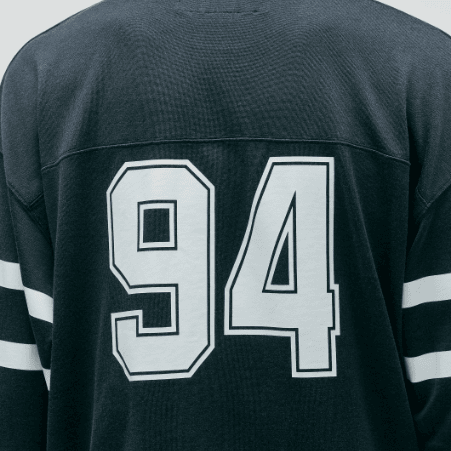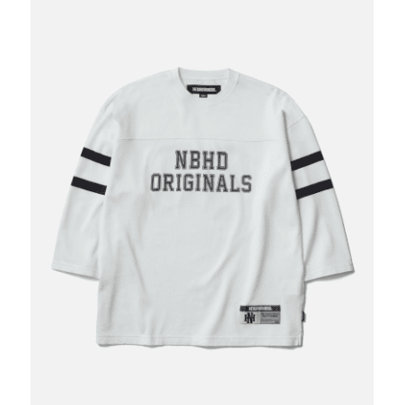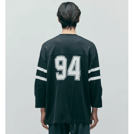 表糸にレーヨンフィラメント糸を使用した適度な光沢感が特徴のフットボールシャツ。 ロゴとブランド創立年、袖部分にラインモチーフをプリント。左裾にネームタグ、サイドシームにピスネームを付属。