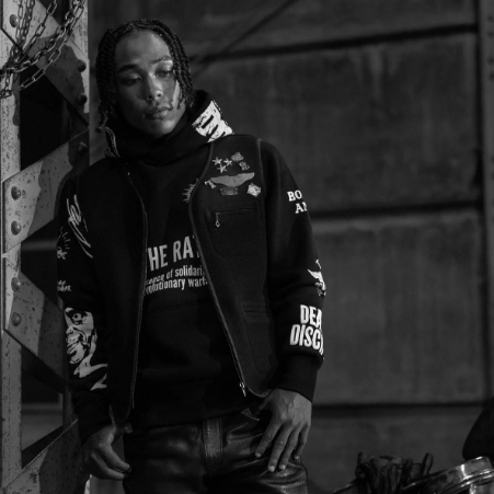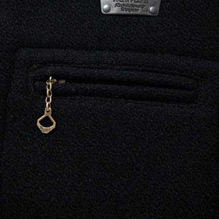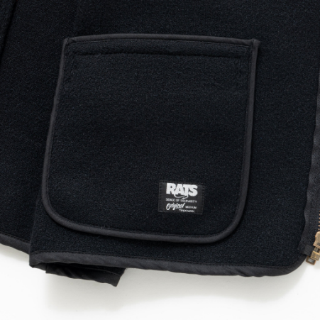 左胸にジッパー付きのポケット、両裾にスリットポケット、左胸ポケット上部にRATS刻印入りメタルプレートを配置。襟・前立て・裾、アームホールにパイピングを施した仕様。WALDES社製ジッパーを使用。身幅はややタイトなシルエット。