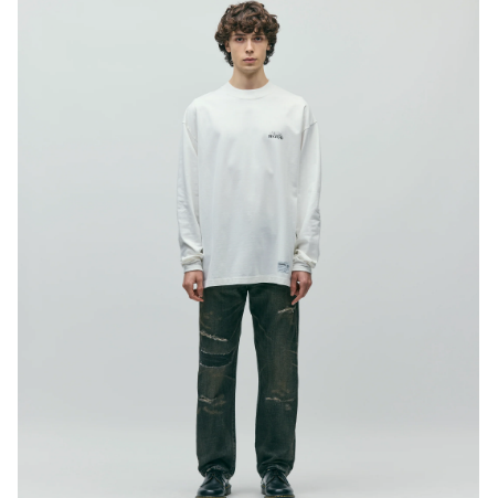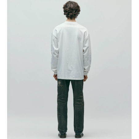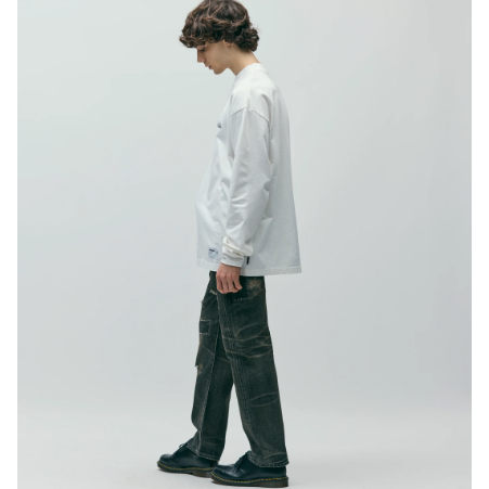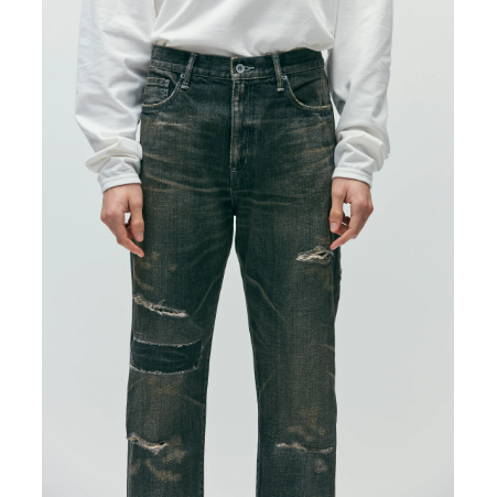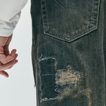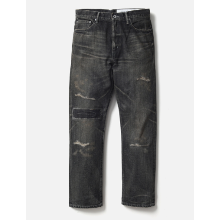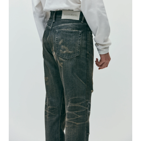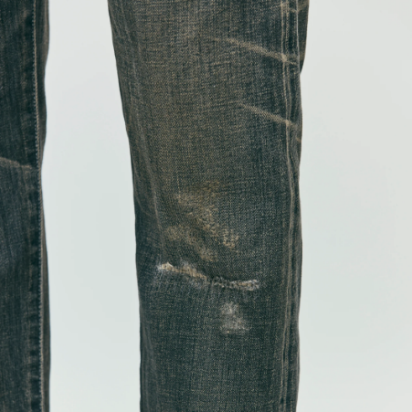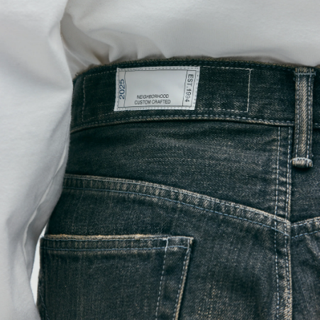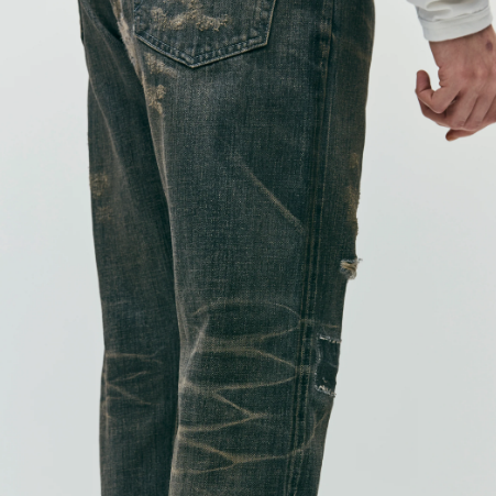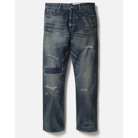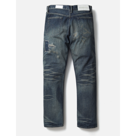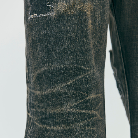 生地からボタン、リベットといったパーツまで、すべてオリジナルで製作した12ozセルヴィッジデニムをベースに、複数のエイジング加工を施したサベージデニムパンツ。ハードな色落ちや裏当てへのウォッシュド加工、ランダムピッチのリメイク技法など、生地の脆化をイメージしたリアルなエイジングが特徴。カスタムクラフテッドアイテム専用のサイズネームを配置。DP WIDEやDP BASICに比べ、加工表現をやや抑えたDP MIDシルエット(腰回りに余裕を持たせた細身のテーパードシルエット)。