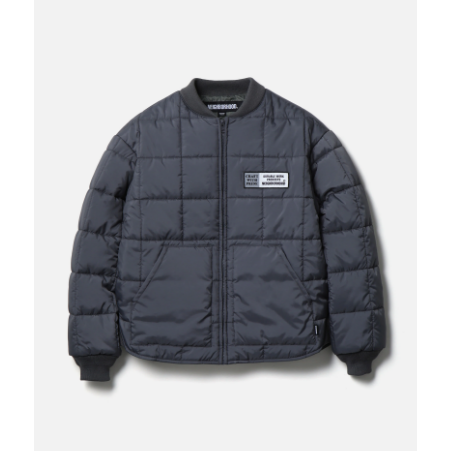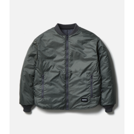 撥水性を備える異なるポリエステルタフタ素材を両面に使用したリバーシブル仕様のパッディドジャケット。表面にはリサイクルポリエステル原料を使用し、フリーフッ素撥水加工を施したポリエステルタフタのキルティング素材を採用。裏面には、静電性と撥水性を兼ね備えたポリエステルタフタ素材を採用。各面にロゴプリントとロゴワッペンを配置。ピスネームを付属。