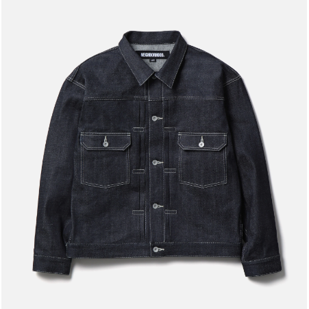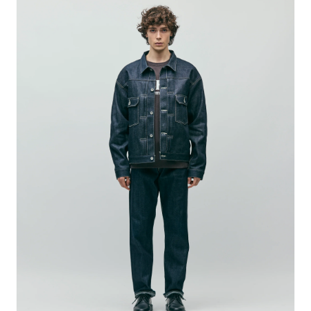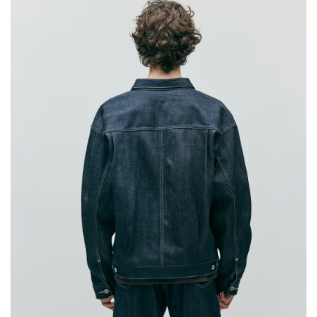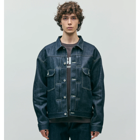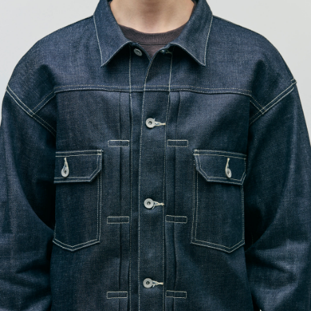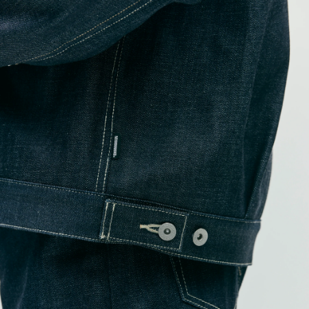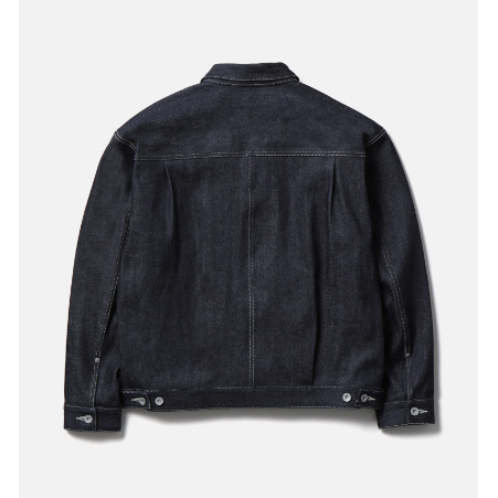 オリジナルの12ozデニム生地を使用した2ndタイプのリジッドデニムジャケット。プリーツ入りのフロントデザイン、左右対称のフラップ付きポケット、アジャストボタン付きの裾ベルトなど、クラシカルなディテールを踏襲。配色ステッチを施し、オリジナルのタックボタンとリベットを採用。サイドシームにピスネームを付属。