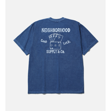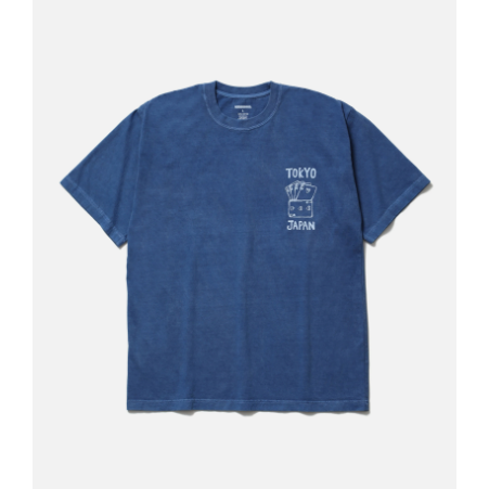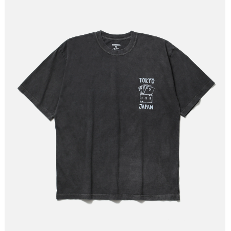 コットン天竺のオリジナルボディーをベースに、顔料染め加工を施したショートスリーブTシャツ。左胸と背面にグラフィックをプリント。ワンウォッシュ。