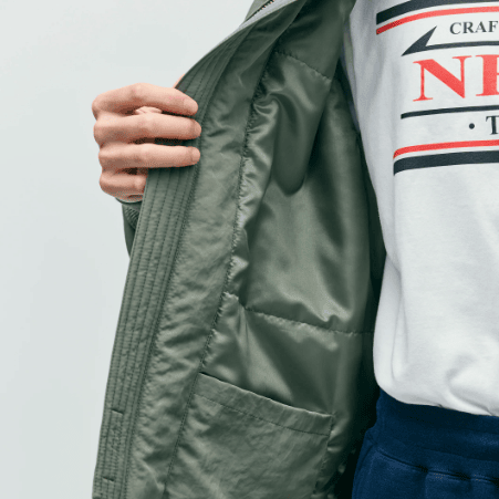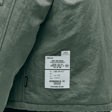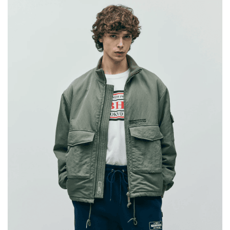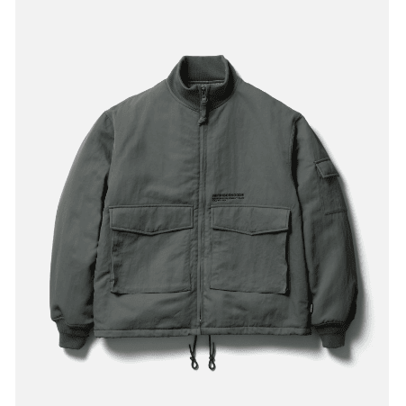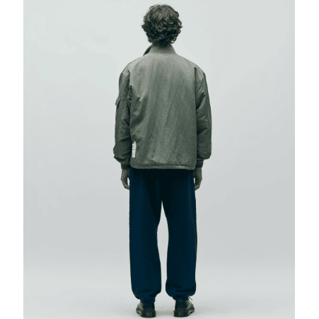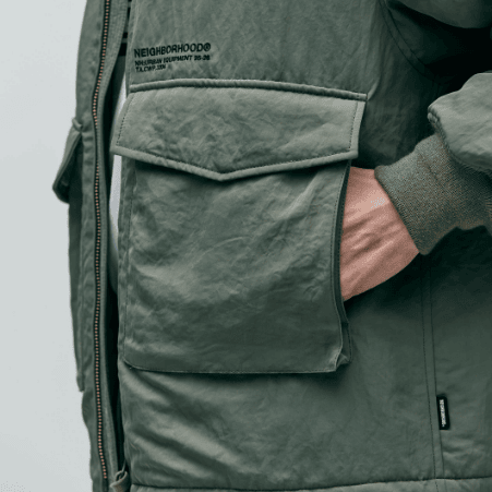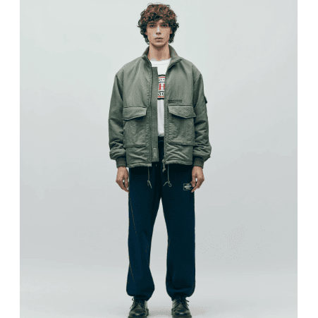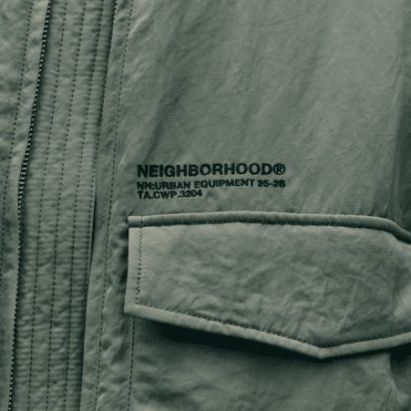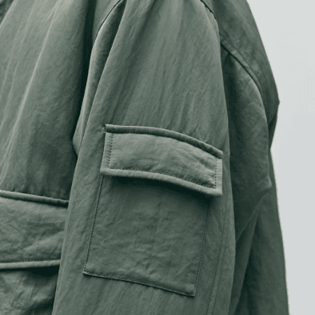 撥水性に優れるコットンライクなナイロンツイル素材(リサイクルナイロン原料)を使用したG-8型ジャケット。両サイドに、上部と側面の両方向から使用できるフラップポケットを配置。裾部分には調節用のドローコードを内蔵。ポケット上部にロゴを刺繍。持ち出しの下側にネームタグ、サイドシームにピスネームを付属。